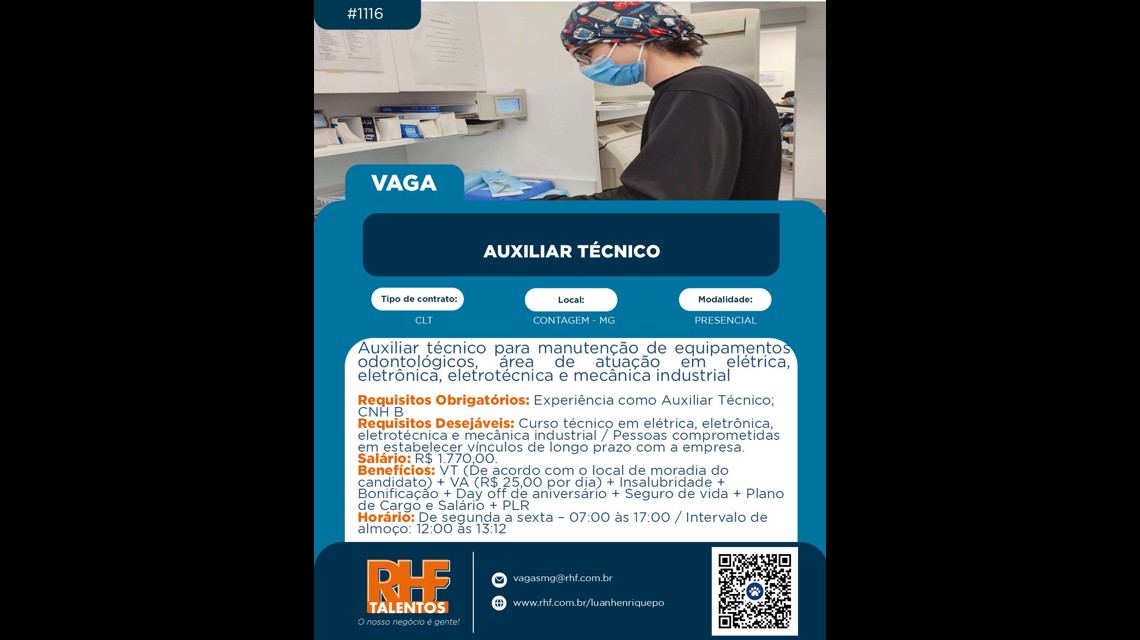 Auxiliar técnico para manutenção de equipamentos odontológicos, área de atuação em elétrica, eletrônica, eletrotécnica e mecânica industrial